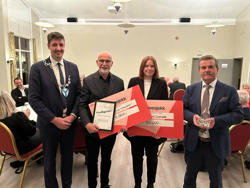 Ordførar Vegard Bjørnevik saman med f.v. Tormod Myklebust ( Frivilligprisen ), Emma Røyrvik Olderkjær ( Kulturstipend ) og Øystein Skaala ( Kulturprisen ).