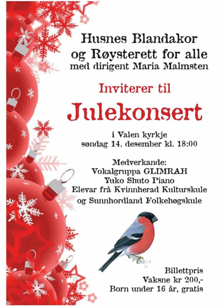 Røysterett for alle og Husnes Blandakor med dirigent Maria Malmsten avsluttar haustsesongen med julekonsert i Valen kyrkje i dag, sundag 14. desember, kl. 18.00. Programmet ser de på plakaten under.