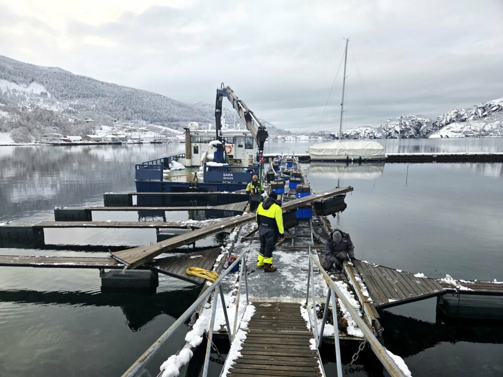 Laurdag 14 februar var dagen me hadde beslutta å klargjera den gamle flytebrygga for transport. Dagen starta litt trått med måking av brygga før me kunne starta med sjølve jobben. Me var veldig heldige som har fått låna båt med krane og mannskap av MOWI så jobben har gått utruleg greit.