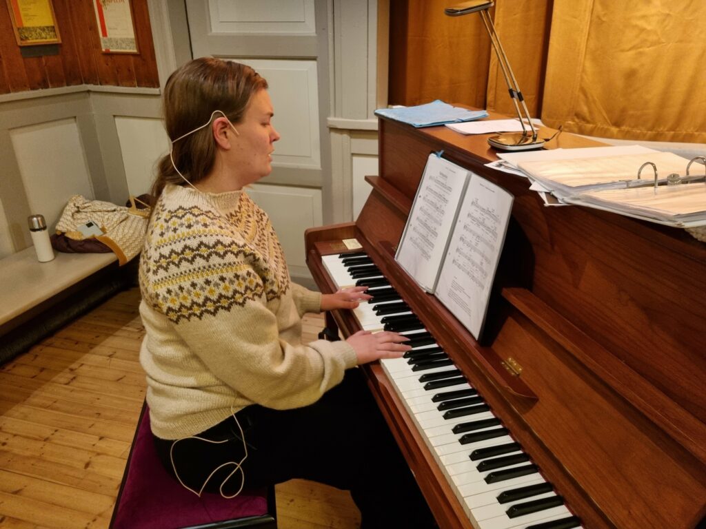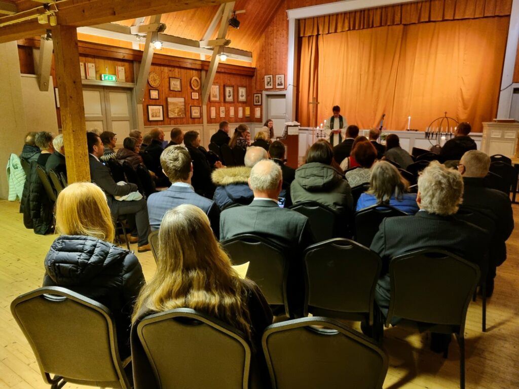 Det er noko meirarbeid med å gjennomføra ei gudsteneste i eit anna rom enn kyrkja. Utstyr med flyttast og monterast i ei rett kyrkjeleg ramme. Det går seg til. Den etterkvart velkjende skipsklokka vert brukt til klokkeklang.