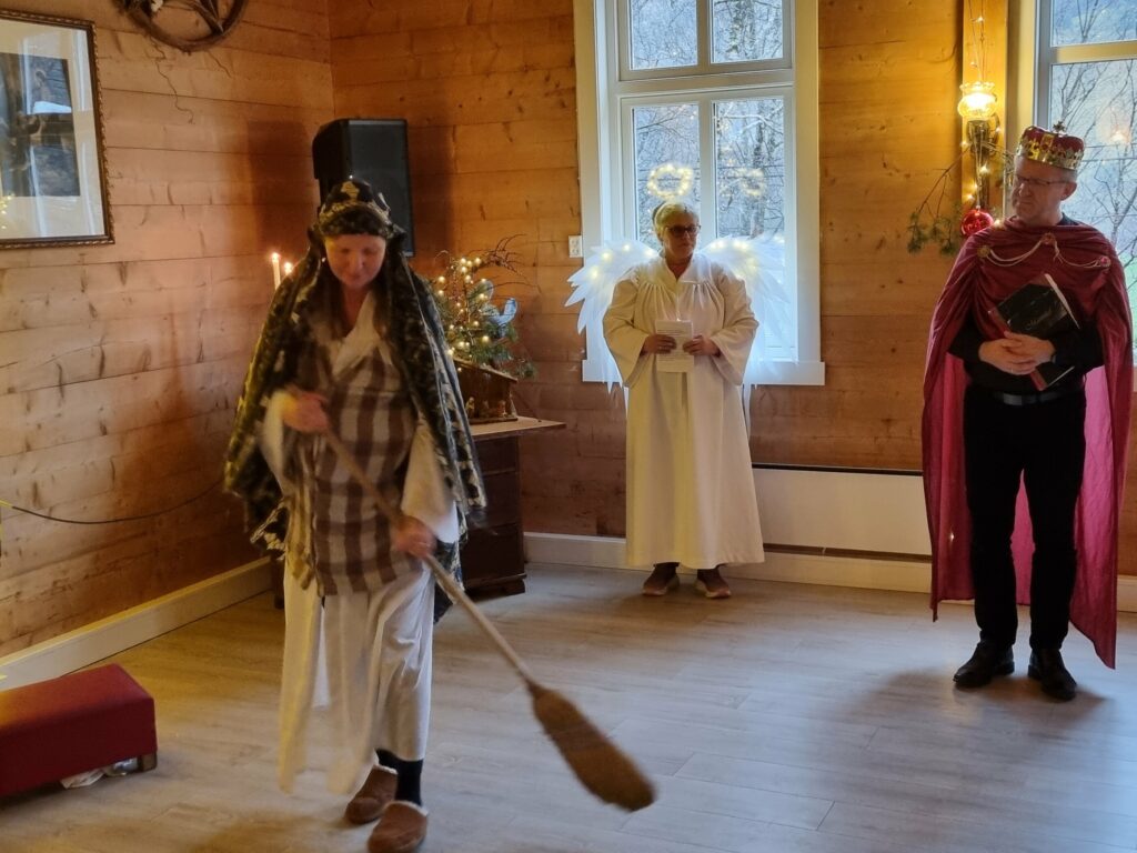 Bedehuset var godt eigna med innleiing og rollefordeling i inngangen. Fylgje endrar opp framme ved Kristusbilete. Alle må i flokk og fylgje vera med då Maria leitar og til slutt finn ein stall der ho føder Jesusbarnet.