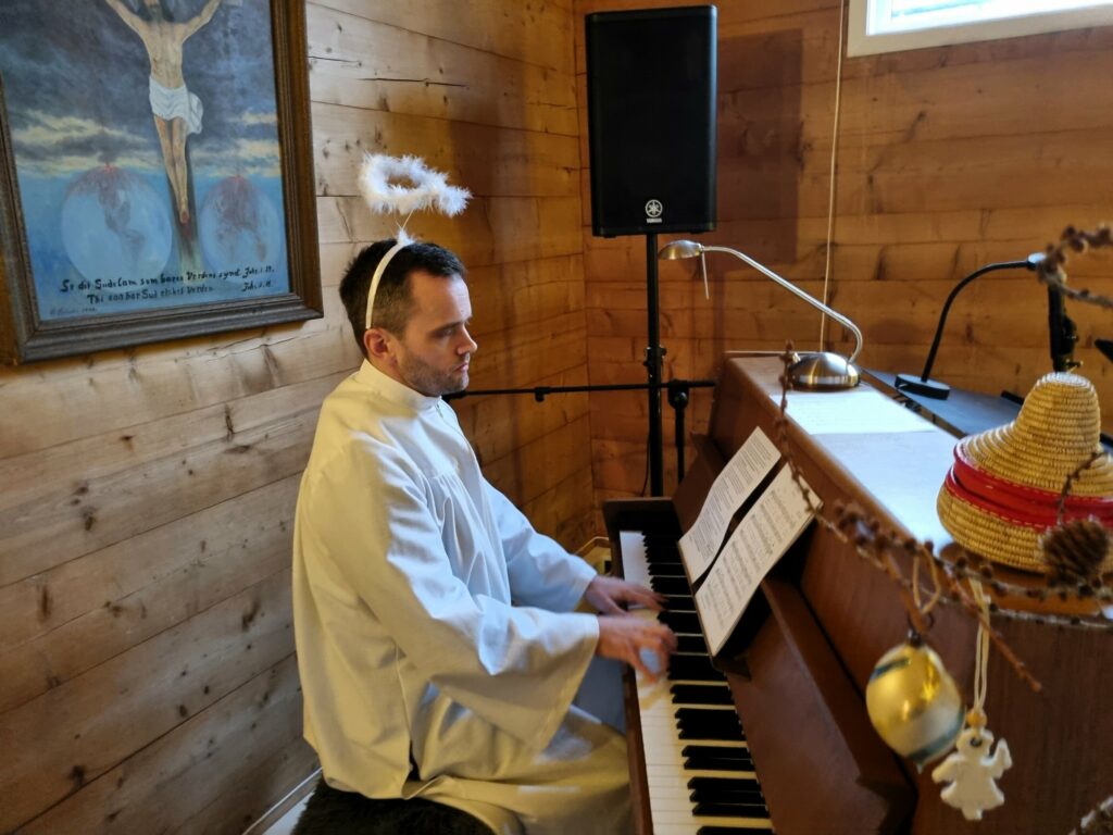 Song og rytme høyrer med. Den nytilsette organisten Andre Eide hadde tonefylgje på piano. Alle syng advents- og julesongar.