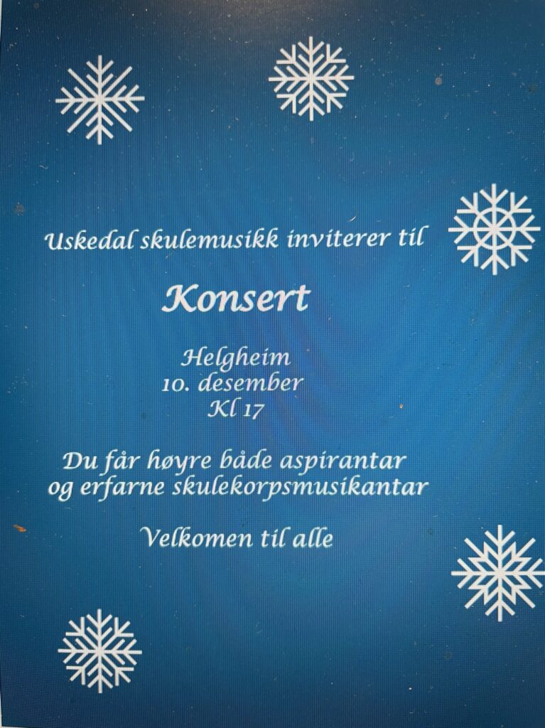 Onsdag 10. desember kl 17 blir det konsert i Helgheim med skulemusikken. Det blir ei hyggeleg stund der me mellom anna får høyre dei fire aspirantane opptre saman med skulekorpsmusikantana for fyrste gong. Programmet er variert – det blir både fellesnummer og nummer i mindre grupper. Alle er hjarteleg velkomne!