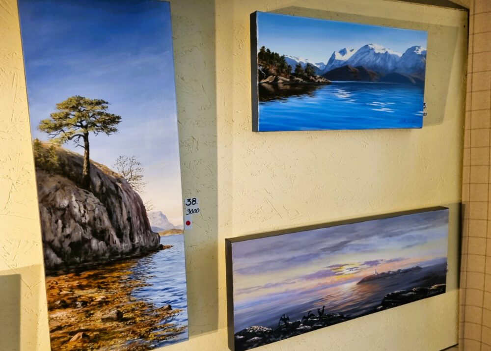 Ingvar Pettersen i Herøysundet må vera storleg nøgd med opninga av måleriutstilling i Grendahuset i dag. Av totalt 47 motiv må sikkert halvparten alt vera selde. For dei som ikkje fekk dette med seg, er det ope også i morgon frå kl. 12.00 til kl. 16.00. Dei fire motiva frå Uskedalen fekk kjapt raude lappar.