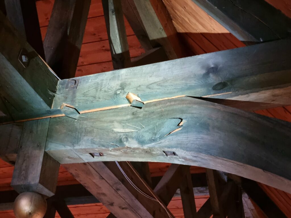 Det har alltid knaka og bråka i kyrkja ved sterk vind. Etter AMY er alt forverra. Bilete og målingar syner at eine langvegen er på veg ut. Det er usikkert kor sterk belastning det er på metallstaga. Det kan vera ein fare for at dei ryk. Det er knekk i søyler og forsyving i konstruksjonen. Måling med loddsnor og lasermåling syner store endringar den siste veka. På 4 meter er det ei forskyving på 14 cm. På galleriet er det synleg forskyving mellom vegg og galleri på 5 cm.