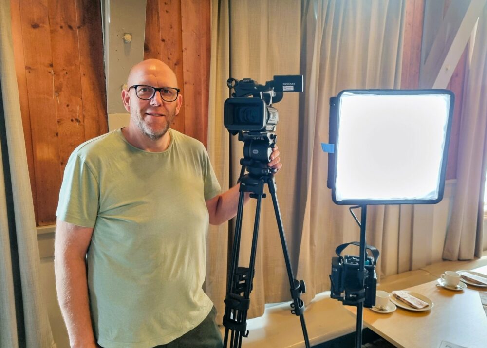 Vårdal Elmedia v/ Karl Petter Vårdal er på plass i Helgheim for klargjering til dokumentasjon av 90 års jubileet til Uskedal Musikklag i morgon. Det er eit oppdrag som krev planlegging og synfaring før sjølve festen. Med fleire kamera, lys og mikrofonar vil Vårdal gjera eit råopptak, som seinare vert redigert. Produketet vert levert musikklaget på ein minnepenn for lagring og arkivering.