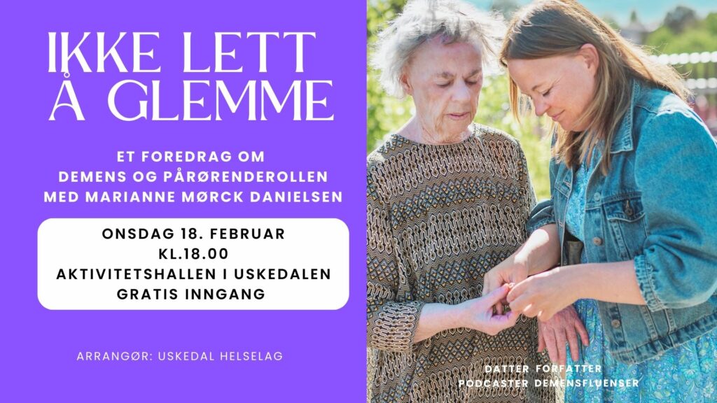 Velkomne til foredraget “Ikke lett å glemme” med fokus på pårørande, nærpersonar og samfunnet rundt i høve demens i Aktivitetshallen i Uskedalen i morgon, 18.2. kl 1800.